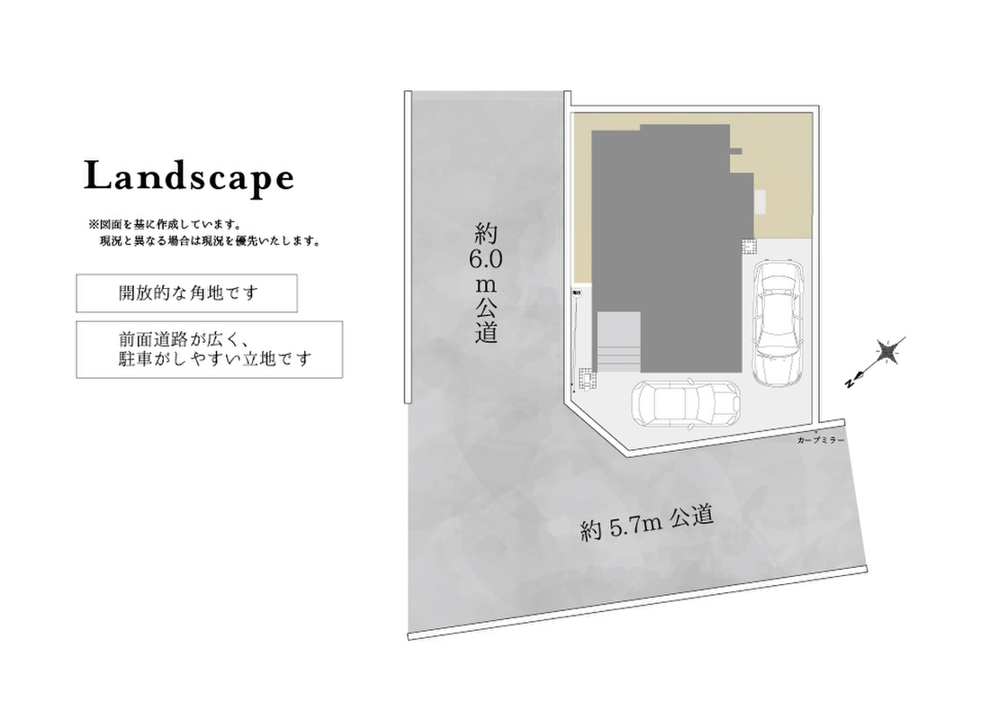 ■角地につき開放的!前面道路は5.7m~6.0mと広くゆったりと駐車ができます。カースペースには駐車2台可能な為、セカンドカーの駐車や来客時の対応にも便利です!※車種によります。