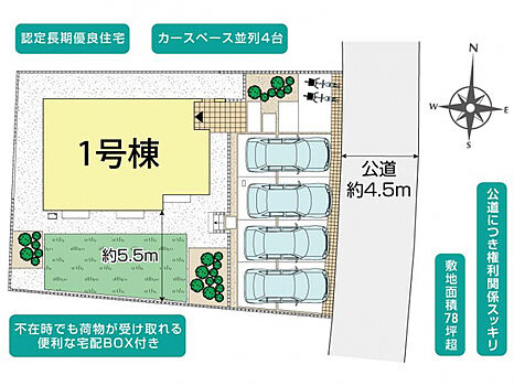 | 駐車場 | 4台 | 道路の幅員 | 東4.5m公道 |