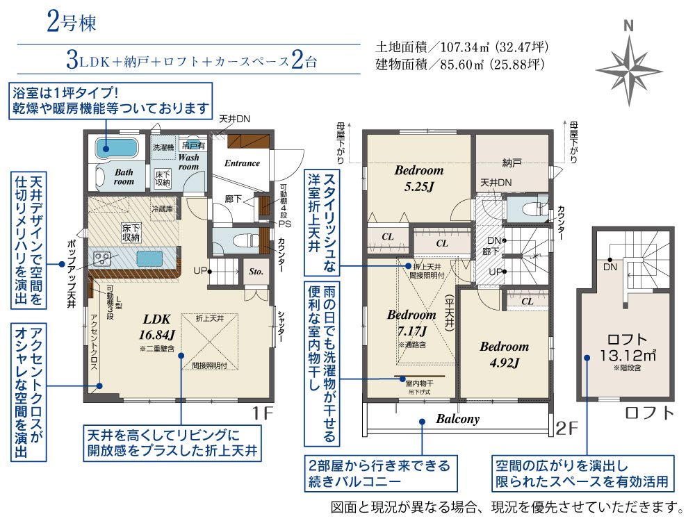 | 建物面積 | 85.60m2(約25.89坪)~86.88m2(約26.28坪) | 土地面積 | 107.34m2(約32.47坪)~107.35m2(約32.47坪) |