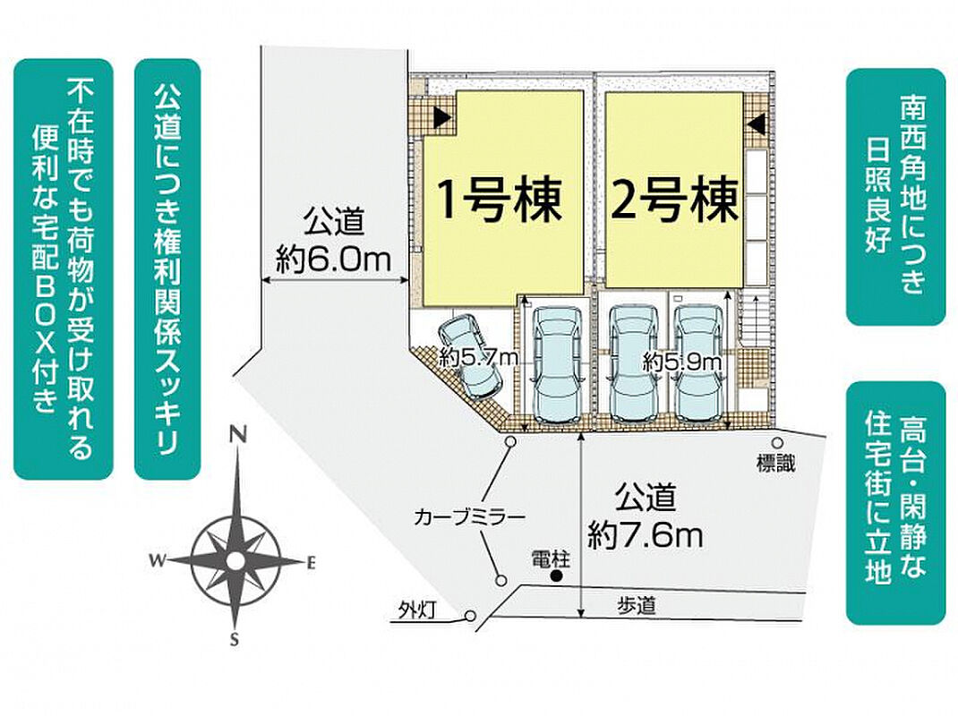 | 駐車場 | 2台 | 道路の幅員 | 西6.0m公道、南7.6m公道 |