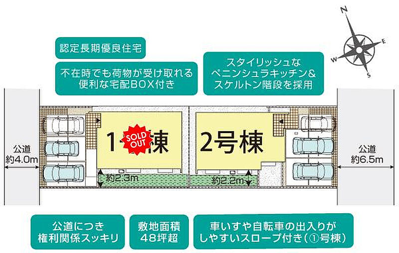| 駐車場 | 2台 | 道路の幅員 | 北西4.0m公道、南東6.5m公道 |