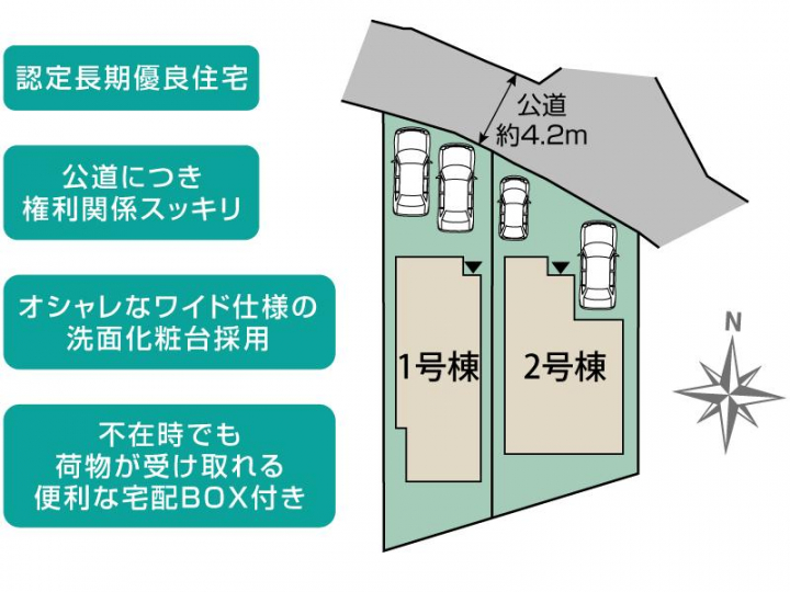 | 駐車場 | 2台 | 道路の幅員 | 北4.2m公道 |