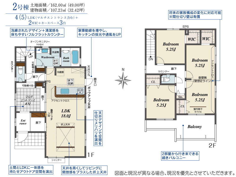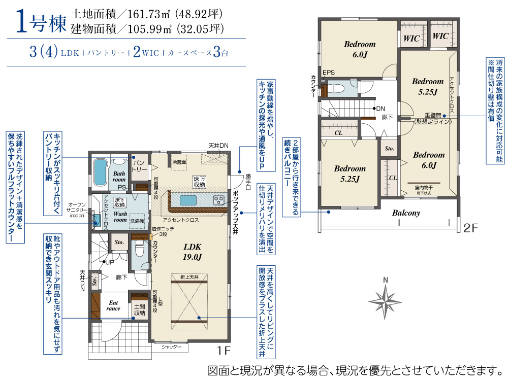 | 建物面積 | 105.99m2(約32.06坪)~107.39m2(約32.48坪) | 土地面積 | 161.73m2(約48.92坪)~162.01m2(約49.00坪) |