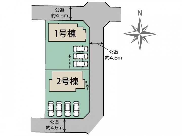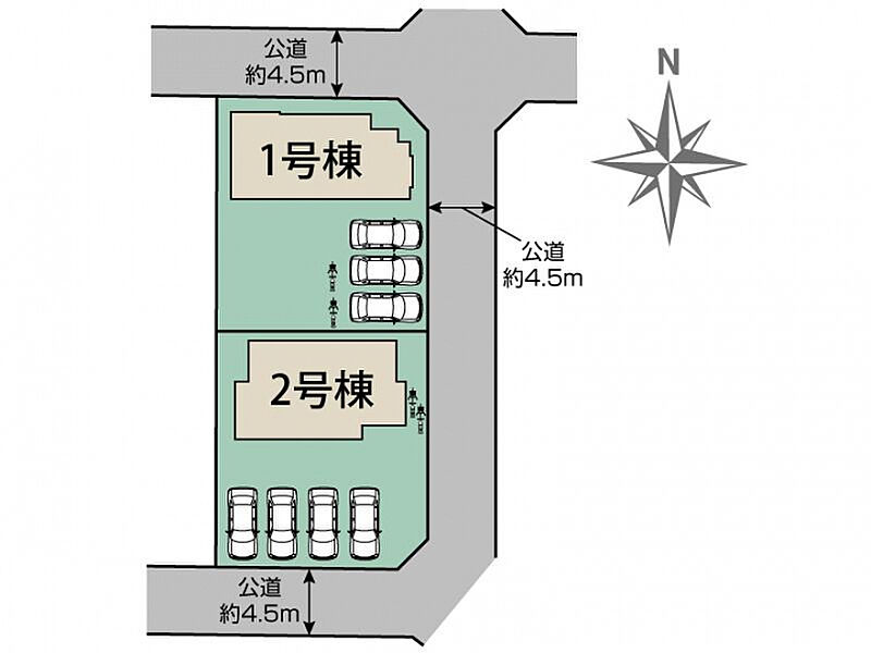 | 駐車場 | 4台 | 道路の幅員 | 東4.5m公道、北4.5m公道、南4.5m公道 |