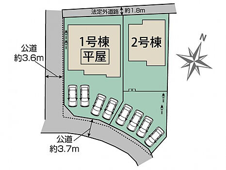 | 駐車場 | 4台 | 道路の幅員 | 西3.6m公道、南3.7m公道、北1.8m法定外道路 |