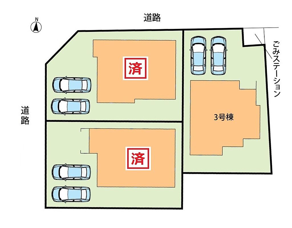 | 駐車場 | 2台 | 道路の幅員 | 北側6m、西側6m、アスファルト舗装 |