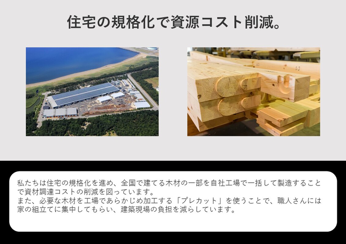 住宅の規格化を進め、全国で建てる木材の一部を自社工場で一括して製造することで資材調達コストの削減、必要な木材を工場であらかじめ加工する、徹底した品質管理など、いい家をリーズナブルに提供できるのはスケールメリットを最大限に活かしているからです。