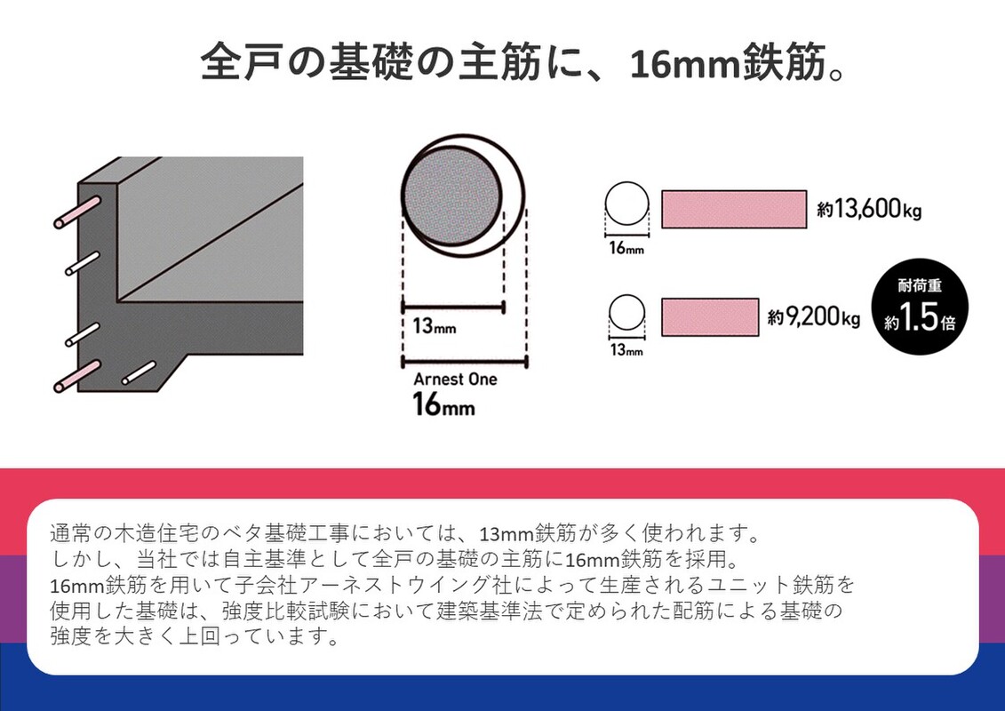 当社の住宅は建築基準法で定められた壁量の1.5倍に達する十分な性能を誇っています。また、当社では自主基準として全戸の基礎の主筋に16mm鉄筋を採用しています。