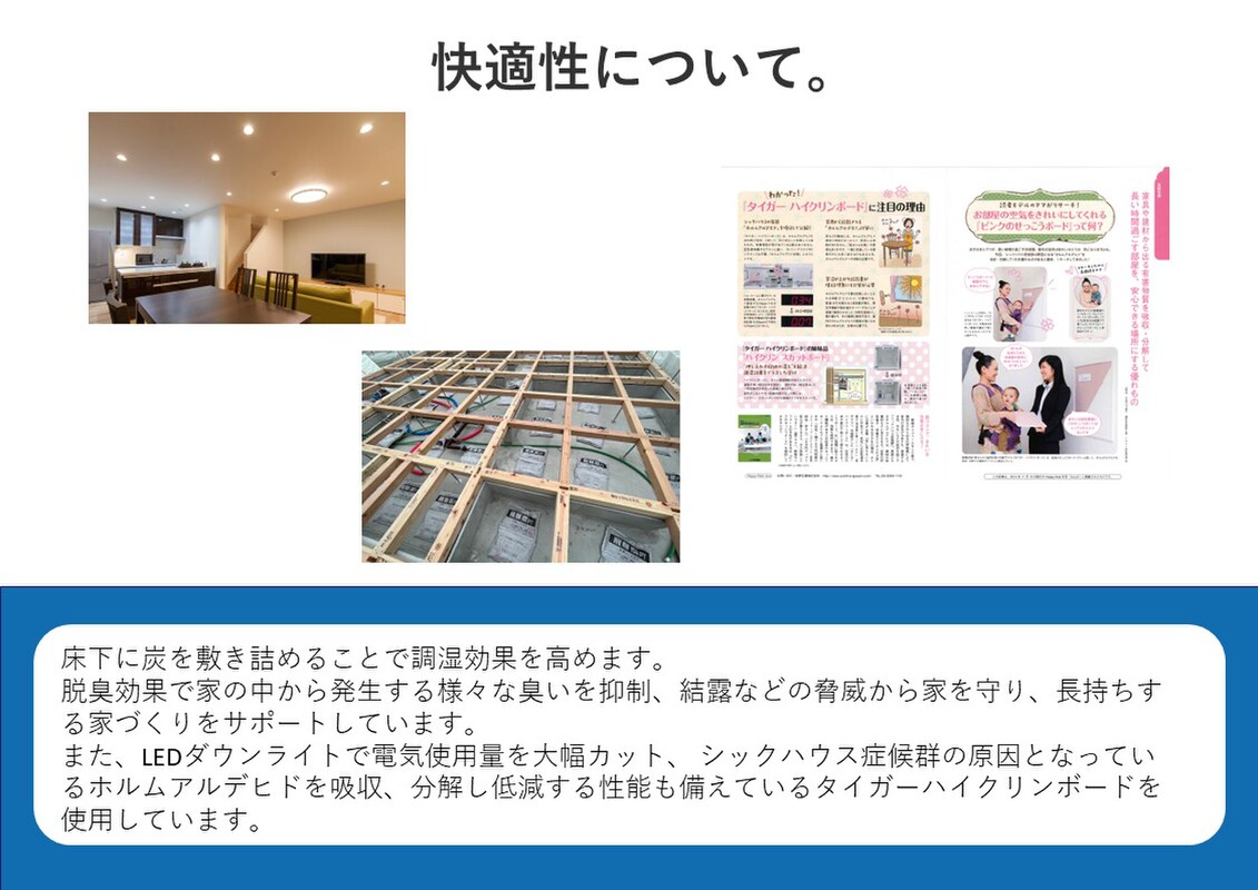 床炭でカビやダニなどの発生をシャットアウト、LEDダウンライトで電気使用量を大幅カット、ホルムアルデヒト吸収分解せっこうボード使用など、快適性を届けます。