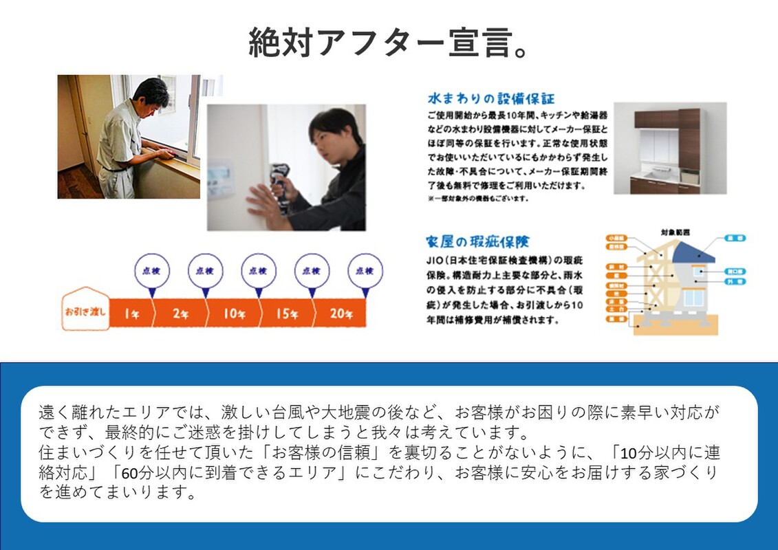 住まいづくりを任せて頂いた「お客様の信頼」を裏切ることがないように、「10分以内に連絡対応」「60分以内に到着できるエリア」にこだわり、お客様に安心をお届けする家づくりを進めてまいります。