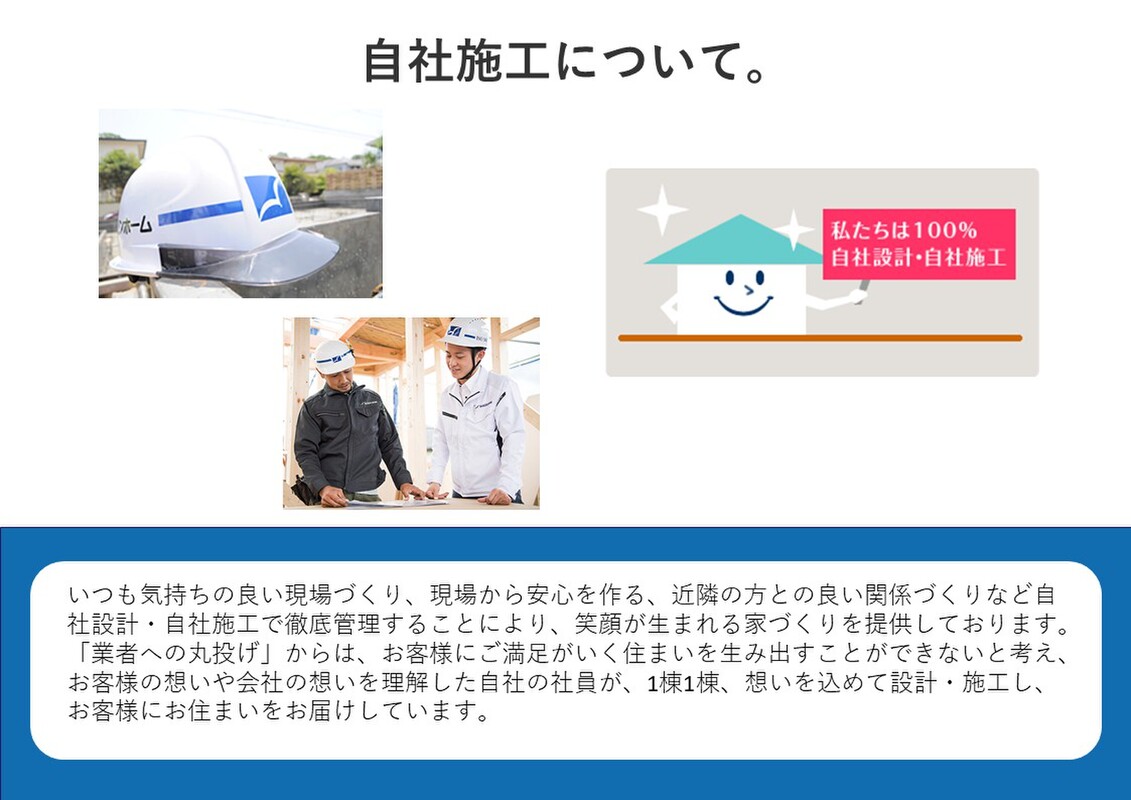 いつも気持ちの良い現場づくり、現場から安心を作る、近隣の方との良い関係づくりなど自社設計・自社施工で徹底管理することにより、笑顔が生まれる家づくりを提供しております。