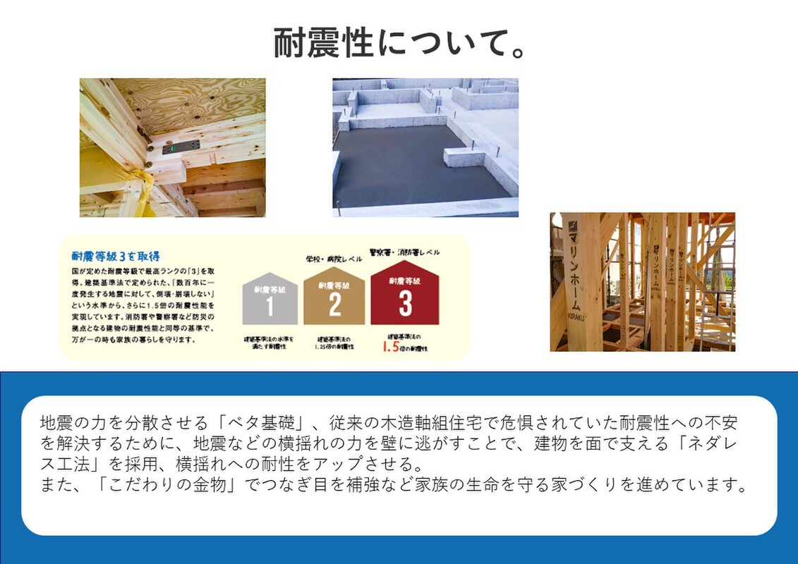 地震の力を分散させる「ベタ基礎」、横揺れへの耐性をアップさせる「剛床」、「こだわりの金物」でつなぎ目を補強など家族の生命を守る家づくりを進めています。