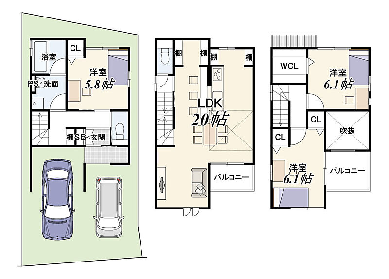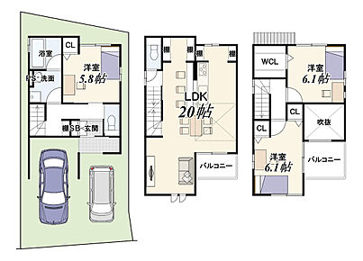 | 建物面積 | 100.48m2(車庫面積8.37m2含む) | 土地面積 | 60.74m2(18.37坪) |