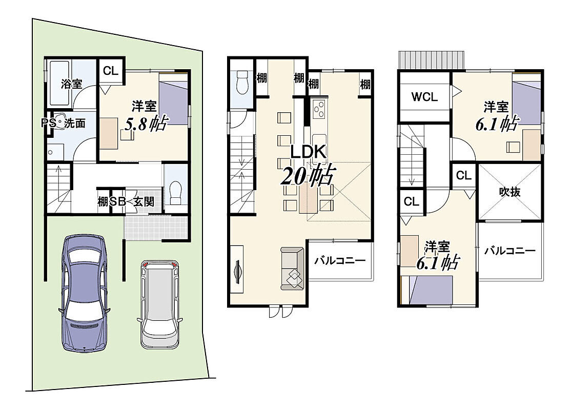 - ※完成予想図やCG合成画像は、門塀・植栽・庭・外観等、実際とは多少異なる場合があります。