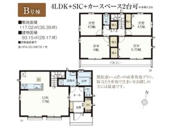 B号棟 間取り 4LDK 価格 5390万円 建物面積 93.15m2 土地面積 117.02m2 -