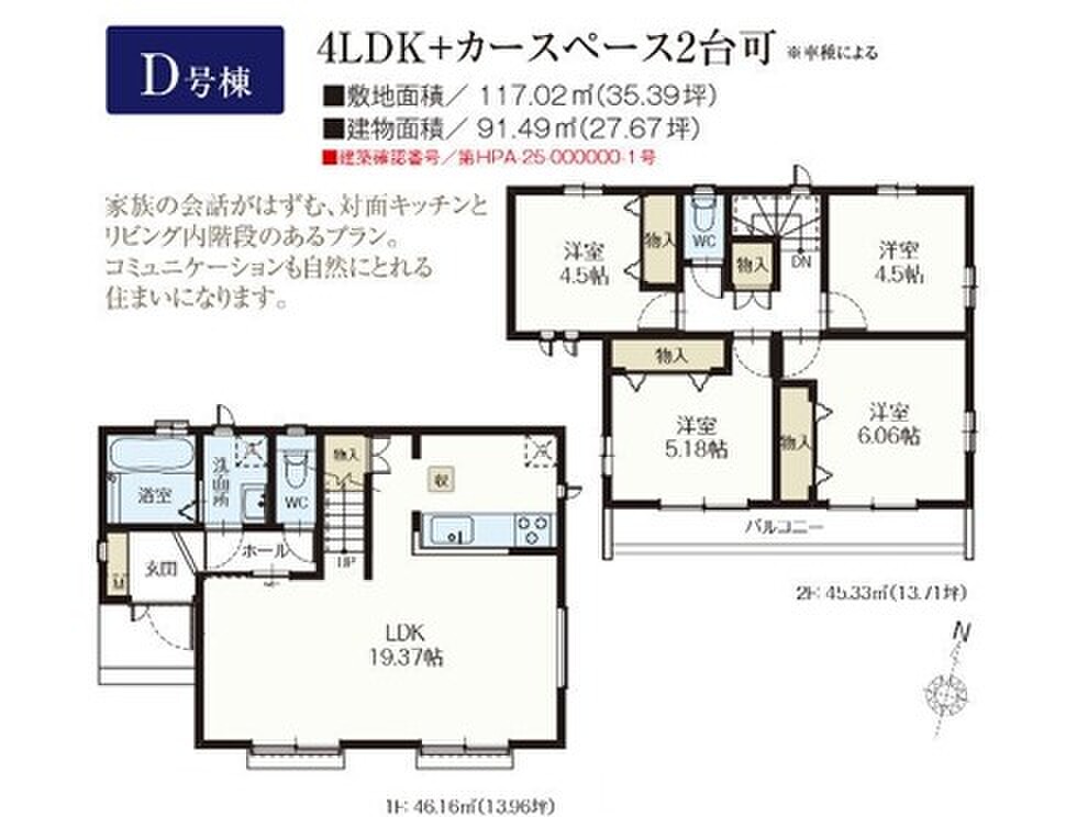 D号棟 間取り 4LDK 価格 5090万円 建物面積 91.49m2 土地面積 117.02m2 -