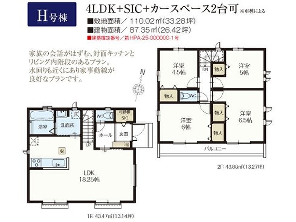H号棟 間取り 4LDK 価格 5090万円 建物面積 92.32m2 土地面積 117.02m2 -