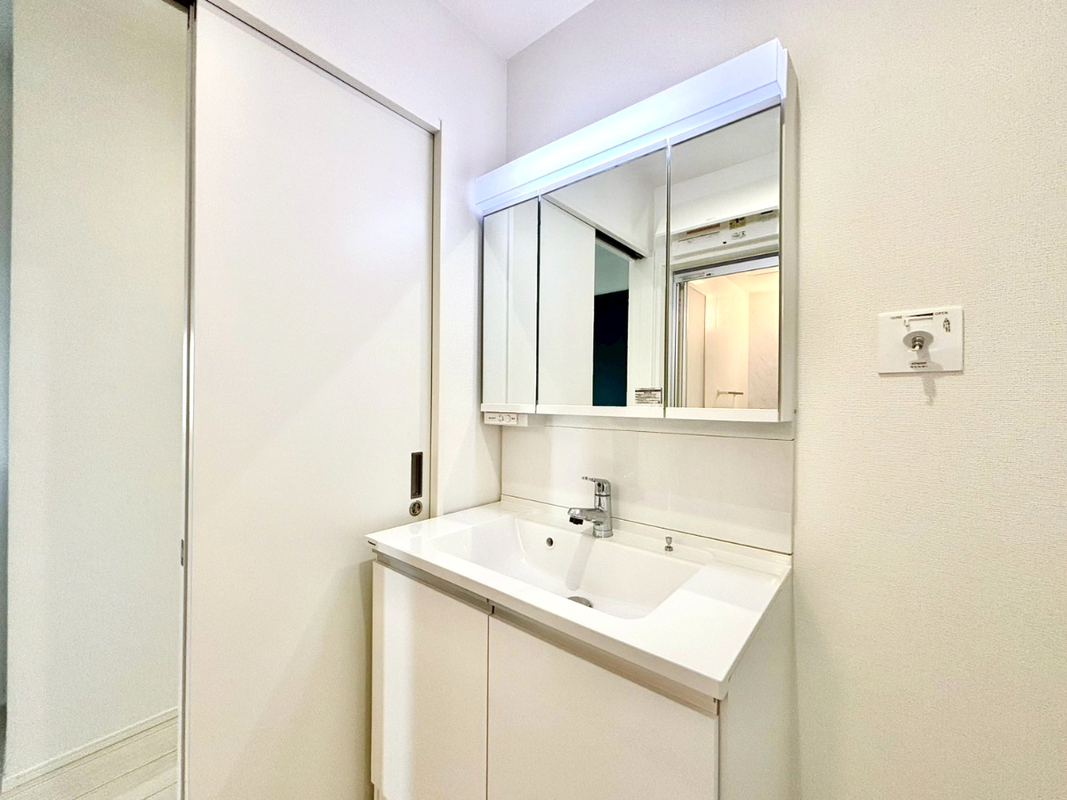大きな三面鏡がついた洗面化粧台。鏡の裏に...