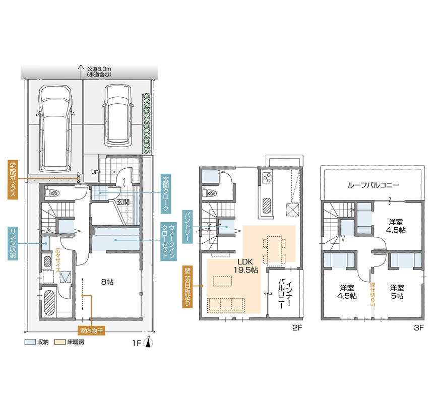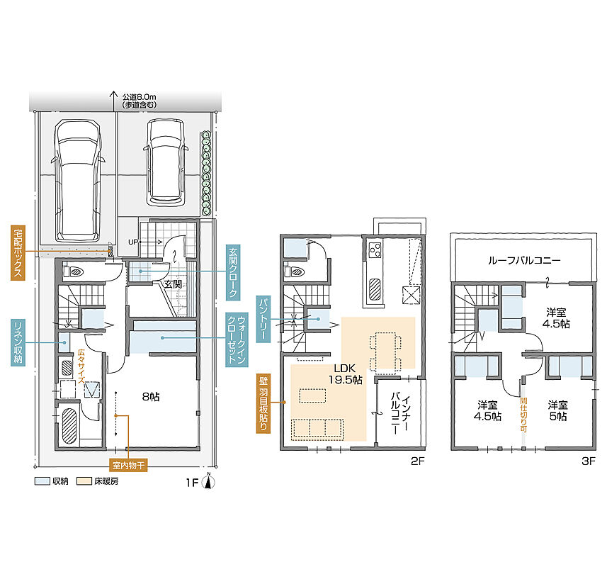 | 駐車場 | 2台 | 道路の幅員 | 北側8.0m(歩道含む) |