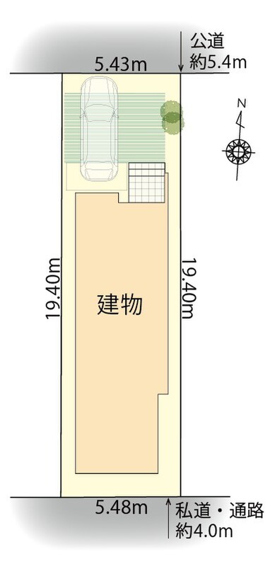 | 駐車場 | 1台 | 道路の幅員 | 北側 幅員約5.4m公道に接面、南側 幅員約4.0m私道・通路に接面 |