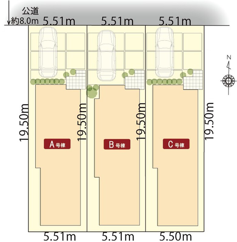 | 建物面積 | 99.15m2(B号棟)~99.59m2(A・C号棟) | 土地面積 | 107.51m2 |