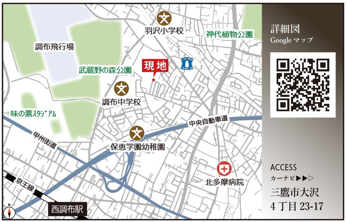 京王線「西調布」駅 徒歩18分 京王線「調布」駅 徒歩26分 小田急バス「大沢四丁目」停 徒歩7分 |