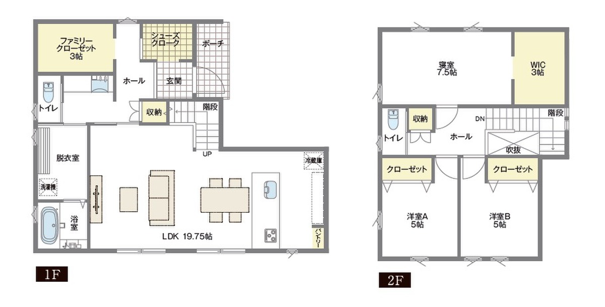 1階には大容量のファミリークローゼットや家事カウンターを設け、家事ラク動線で暮らしやすさも両立。