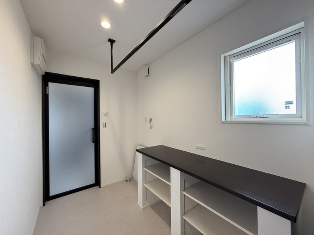 魅力3 脱衣室には室内干しユニットとワークカウンターを備え、洗濯から片付けまでを完結!