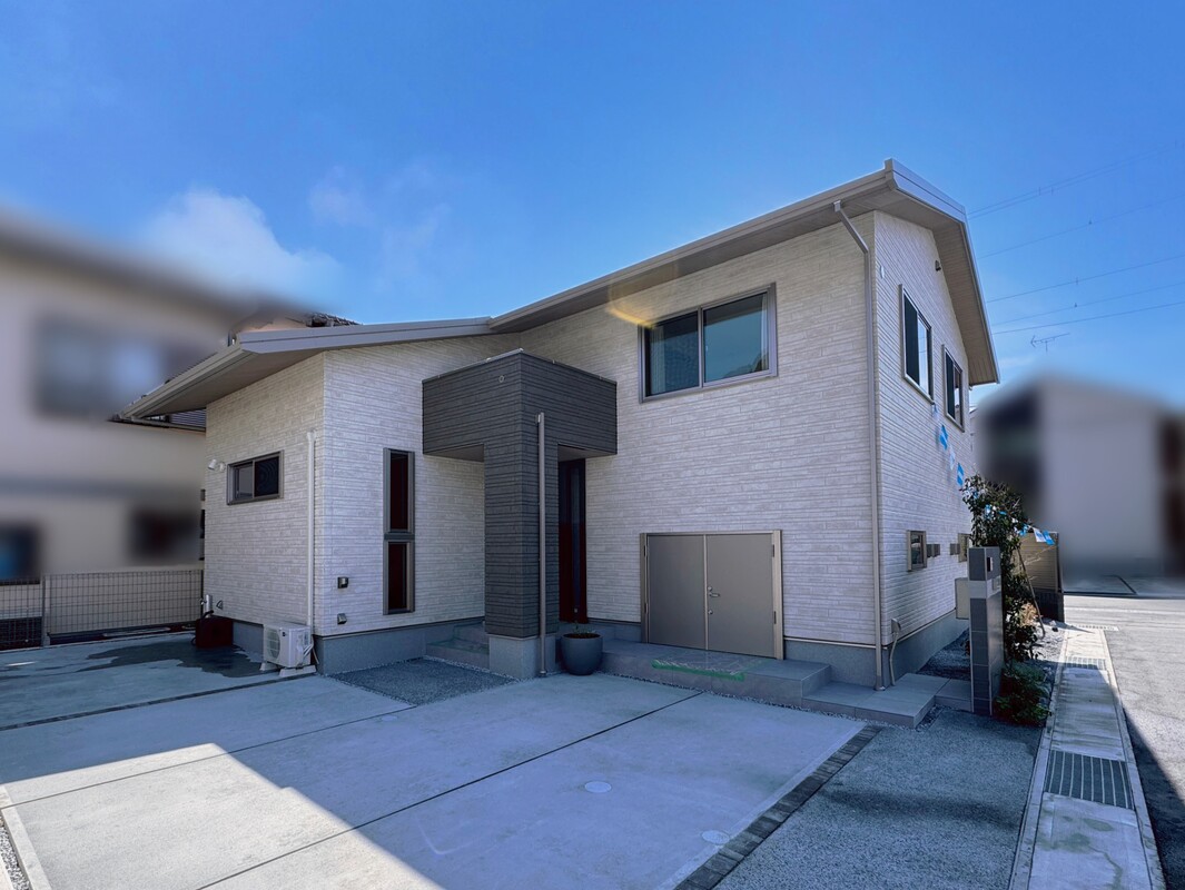 魅力3 外壁の貼りわけがアクセント。敷地が広いので駐車もゆとりをもってできます。