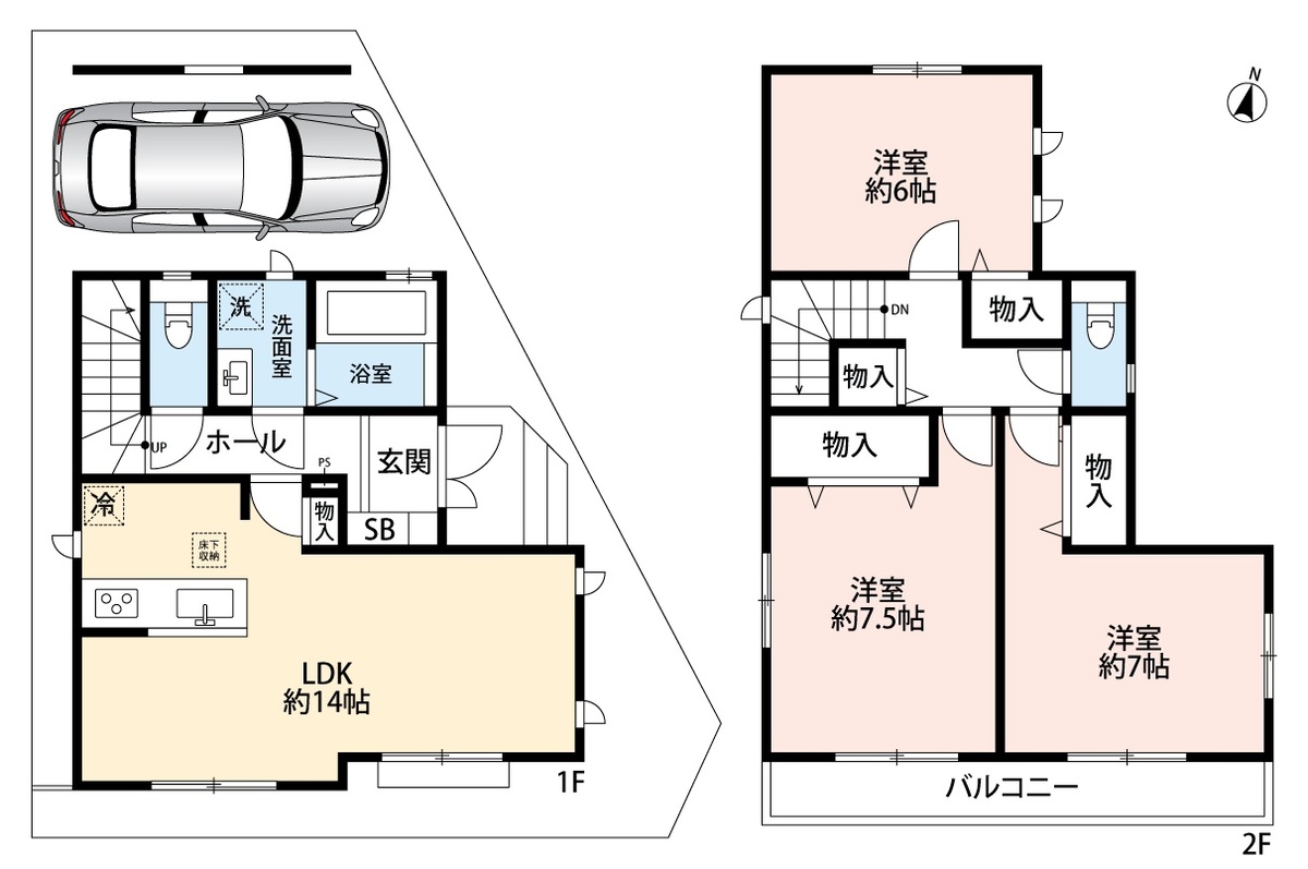 D号地 間取り 3LDK 価格 4490万円 建物面積 85.28m2 土地面積 79.84m2 -