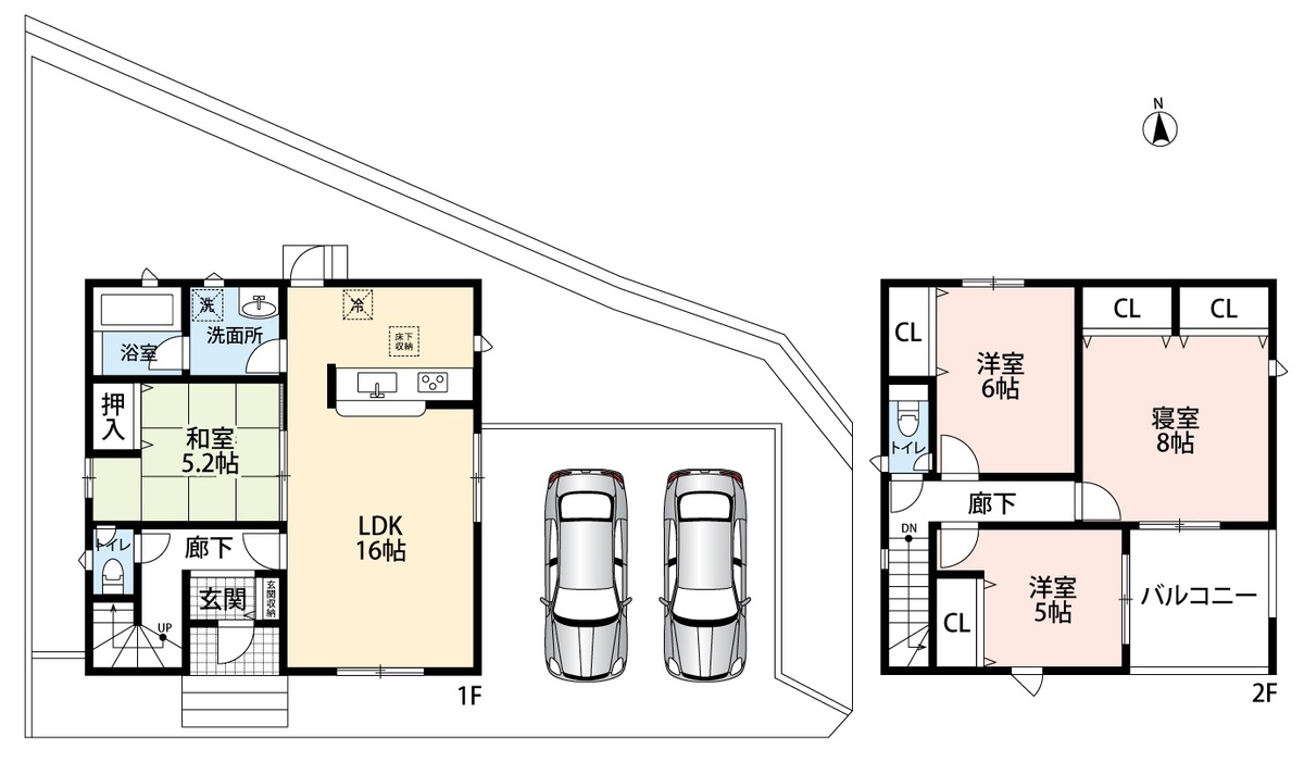 | 駐車場 | 2台 | 道路の幅員 | 44.63m2、東6m幅 |