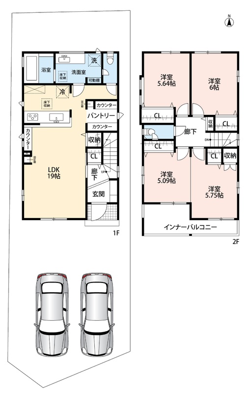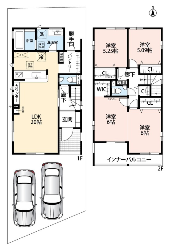 2号地 間取り 3LDK 価格 4250万円 建物面積 105.51m2~105.57m2 土地面積 124.26m2