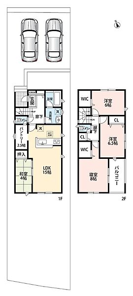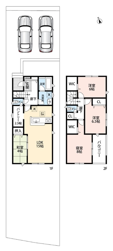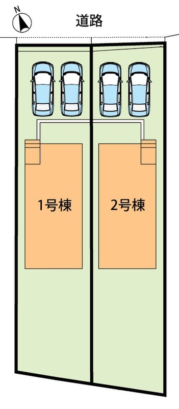 | 駐車場 | 2台 | 道路の幅員 | 道路幅:4m、アスファルト舗装、自主後退:(1号地)3.84m2、(2号地)3.36m2 |