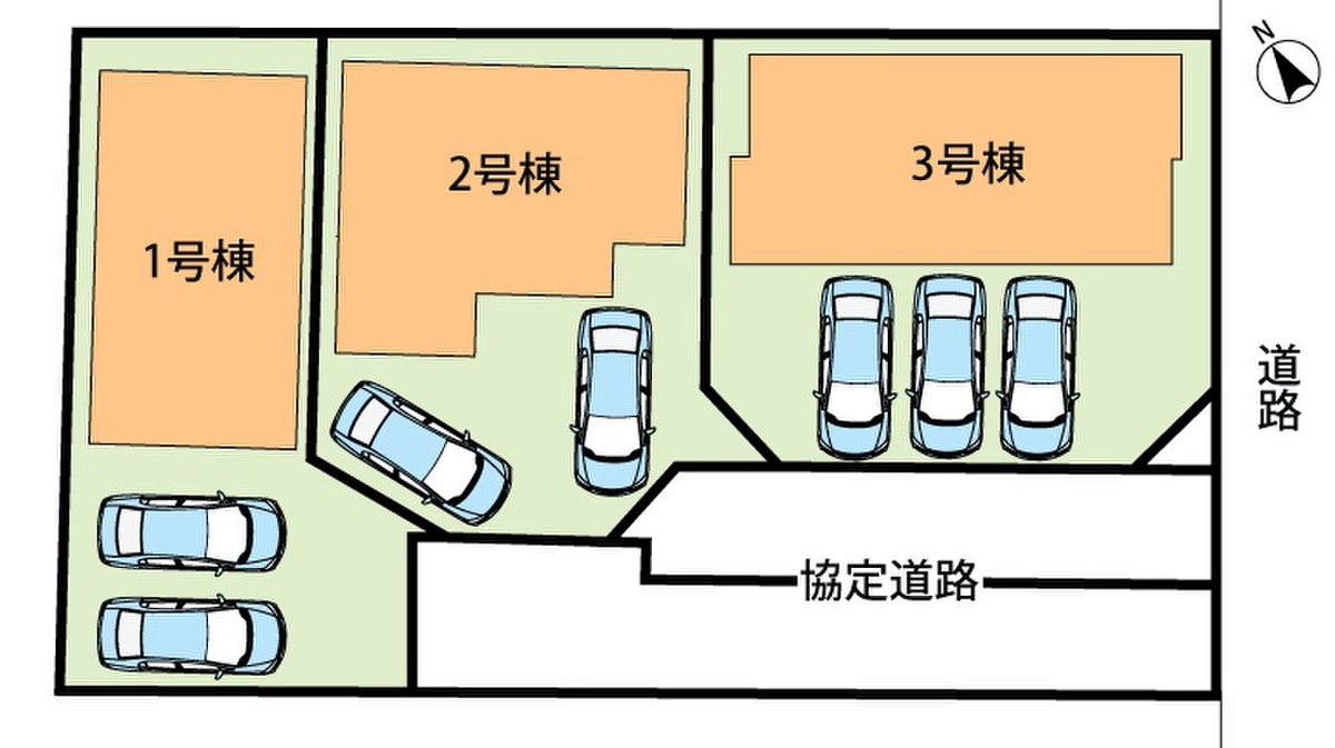| 駐車場 | 2台 ~ 3台 | 道路の幅員 | 6m、アスファルト舗装、協定道路:(1号地)70.57m2、(2号地)46.30m2、(3号地)2. |