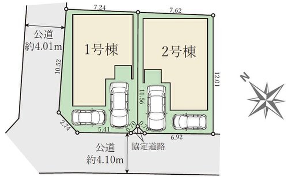 | 駐車場 | 2台 | 道路の幅員 | 北西側4m、南西側4.1m |