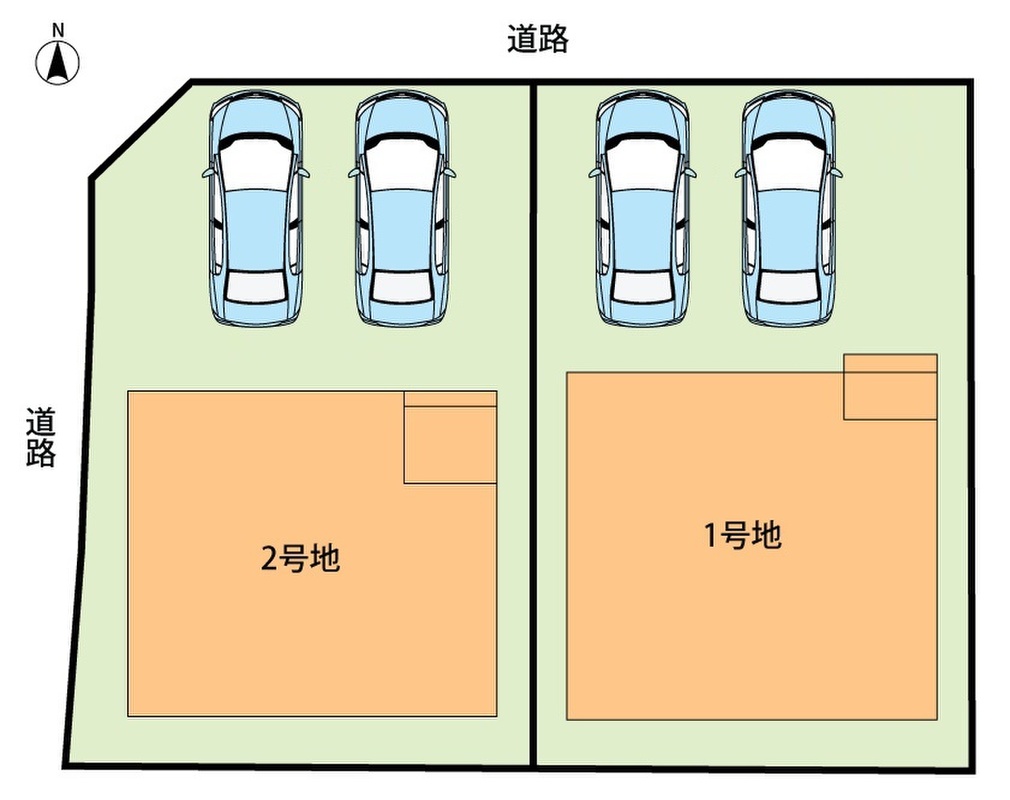 | 駐車場 | 2台 | 道路の幅員 | 道路幅:4m・6.2m、アスファルト舗装、道路負担:(1号地)17.33m2、(2号地)34.49m |