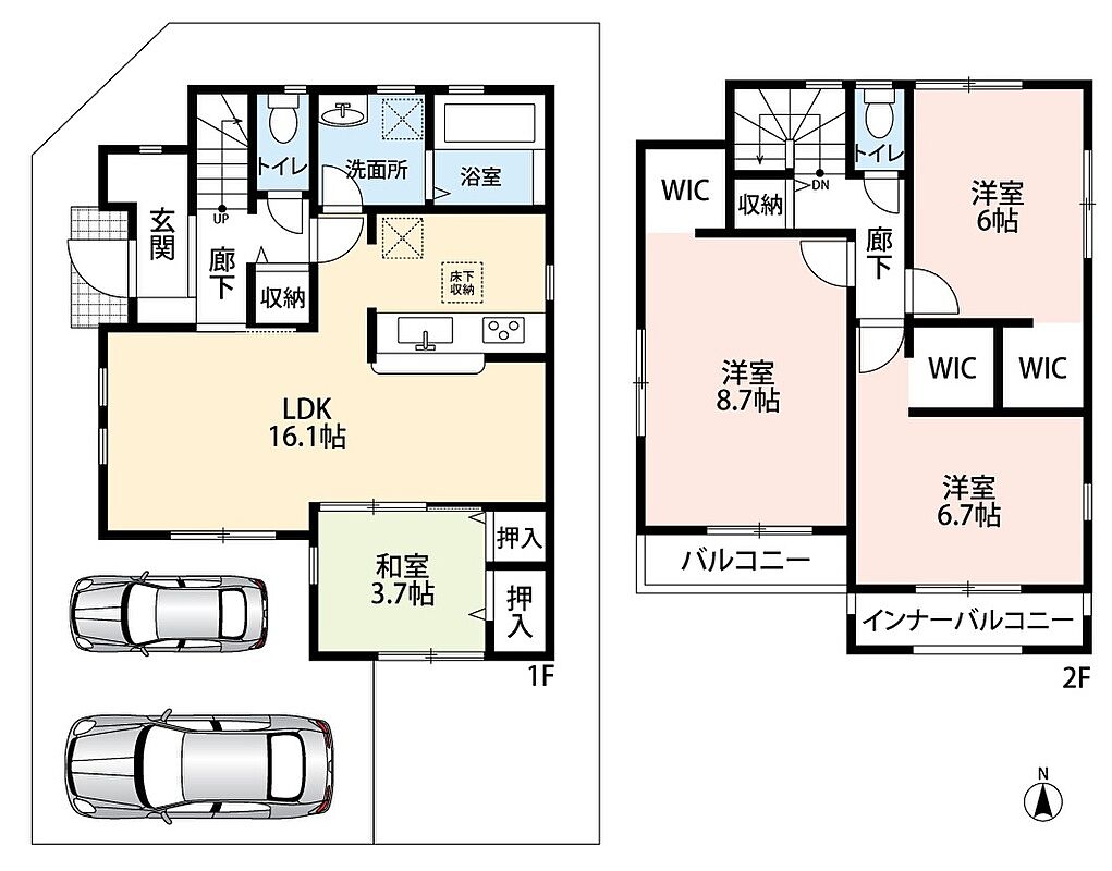 | 駐車場 | 2台 | 道路の幅員 | 無、西4m幅、北3.2m幅 |