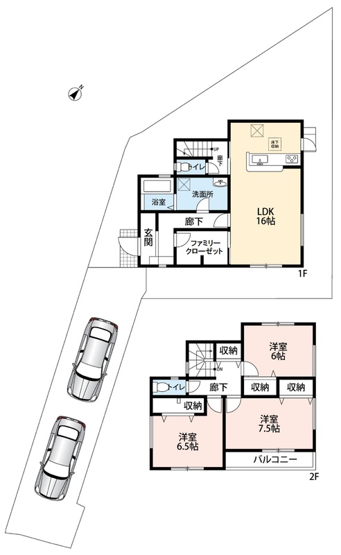 | 駐車場 | 2台 | 道路の幅員 | 道路幅:2.5m~3.5m、アスファルト舗装、セットバック:(1号地)11.96m2、(2号地)5. |