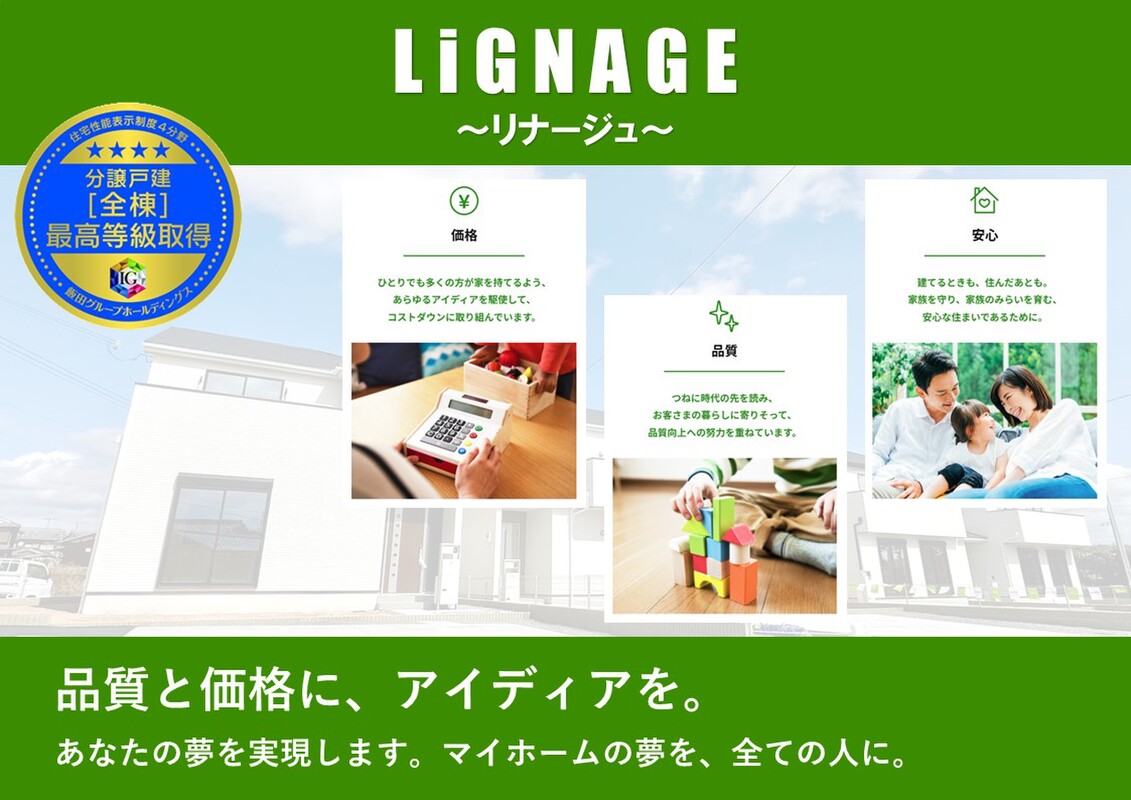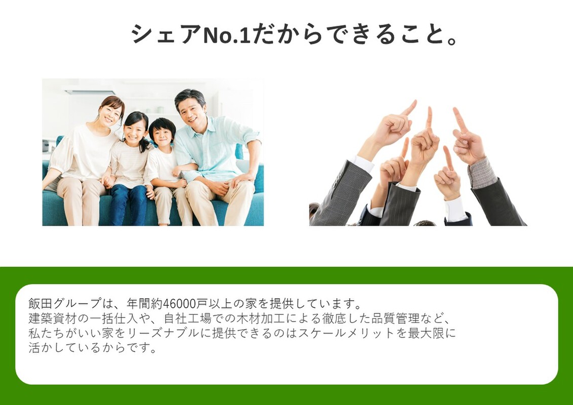 飯田グループは、年間約46000戸以上の家を提供しています。分譲住宅日本一だからこそできる「好立地」「高品質」な家を「好価格」でお届けしています。
