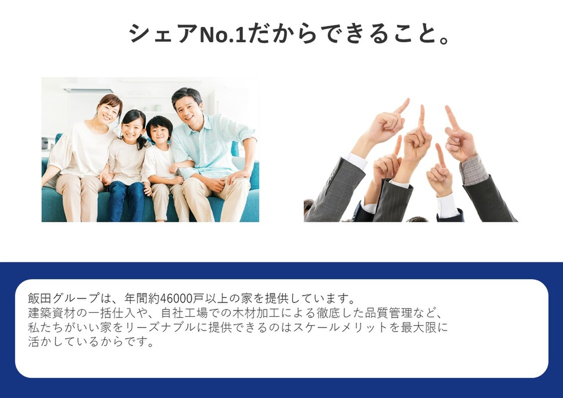 飯田グループは、年間約46000戸以上の家を提供しています。分譲住宅日本一だからこそできる「好立地」「高品質」な家を「好価格」でお届けしています。