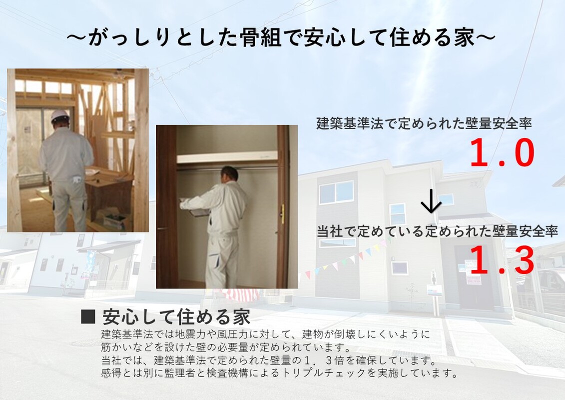 建築基準法では地震力や風圧力に対して、建物が倒壊しにくいように、筋かいなどを設けた壁の必要量が定められ、当社では、建築基準法で定められた壁量の1.3倍を確保しています。