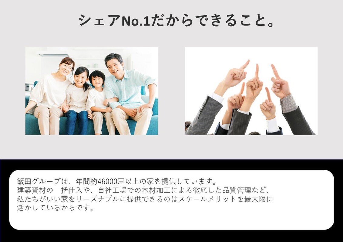 飯田グループは、年間約46000戸以上の家を提供しています。分譲住宅日本一だからこそできる「好立地」「高品質」な家を「好価格」でお届けしています。