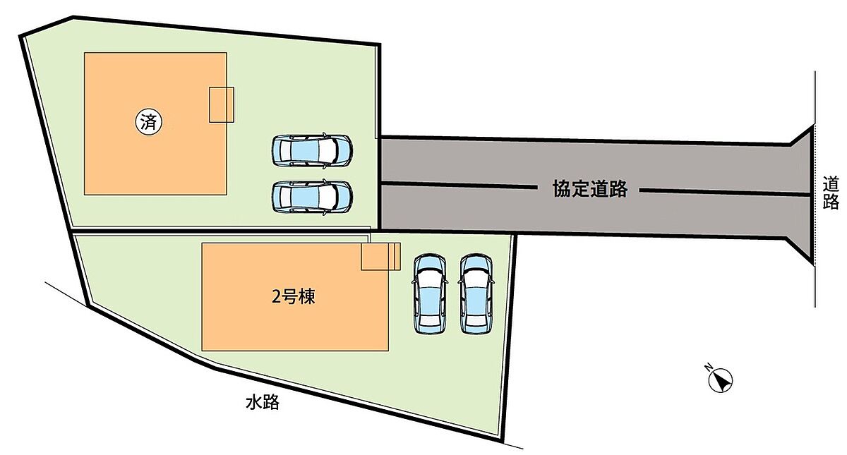 | 駐車場 | 2台 | 道路の幅員 | 道路幅:3.6m、アスファルト舗装、協定道路:(1号地)52.41m2、(2号地)52.77m2 |