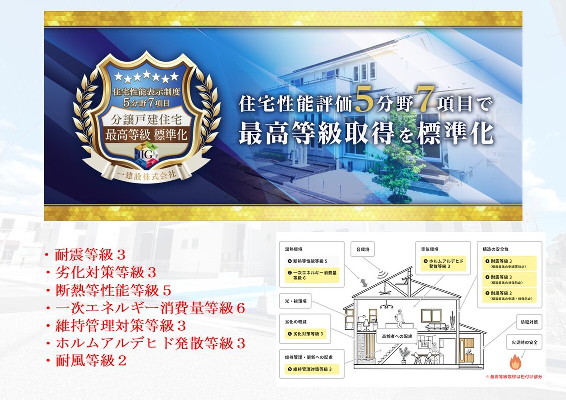 国土交通大臣に登録を行った、第三者機関の登録住宅性能評価機関に所属する評価員がチェックを行い、耐震等級など4分野6項目において最高等級取得しておりますので、安心です。