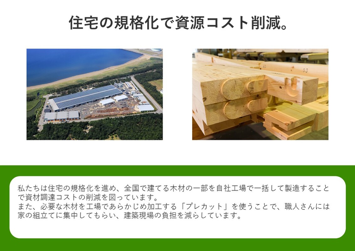 住宅の規格化を進め、全国で建てる木材の一部を自社工場で一括して製造することで資材調達コストの削減、必要な木材を工場であらかじめ加工する、徹底した品質管理など、いい家をリーズナブルに提供できるのはスケールメリットを最大限に活かしているからです。