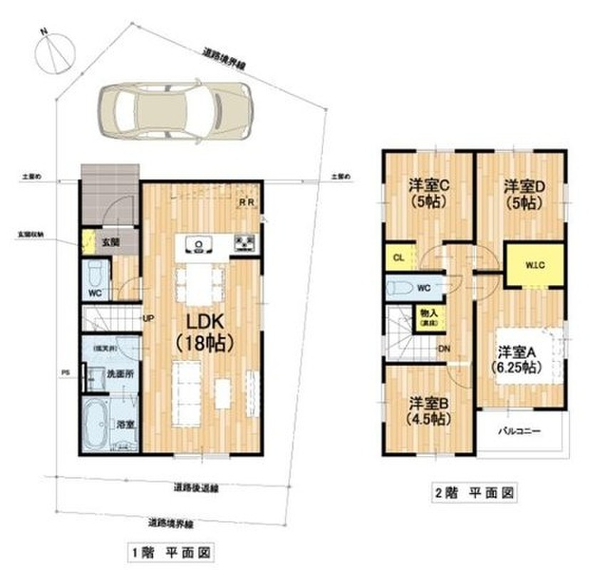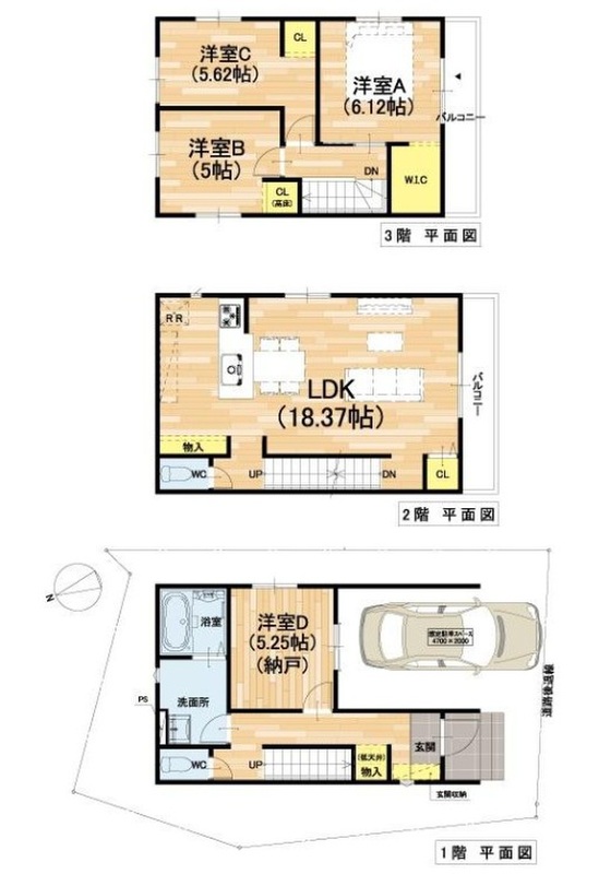 | 間取り | 4LDK | 建物構造 | 木造2階建(軸組工法)、木造3階建(軸組工法) |