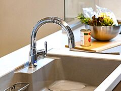 ●料理中も手をかざすだけで簡単に操作!便利さが際立つタッチレス水栓を採用しました。