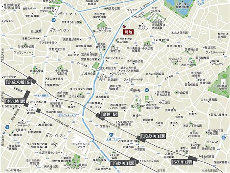 - JR総武線「本八幡」駅 徒歩27分~29分京成本線「鬼越」駅 徒歩19分~20分JR武蔵野線「船橋法典」駅 徒歩37分~38分