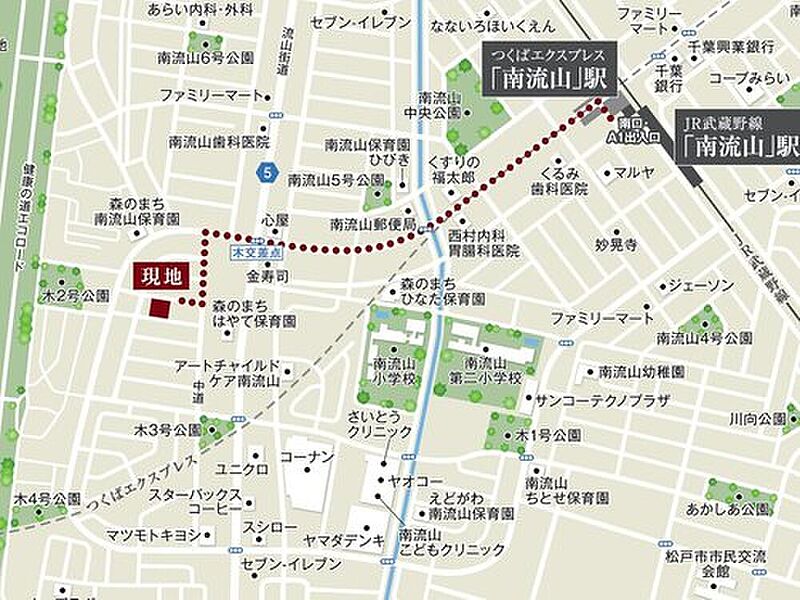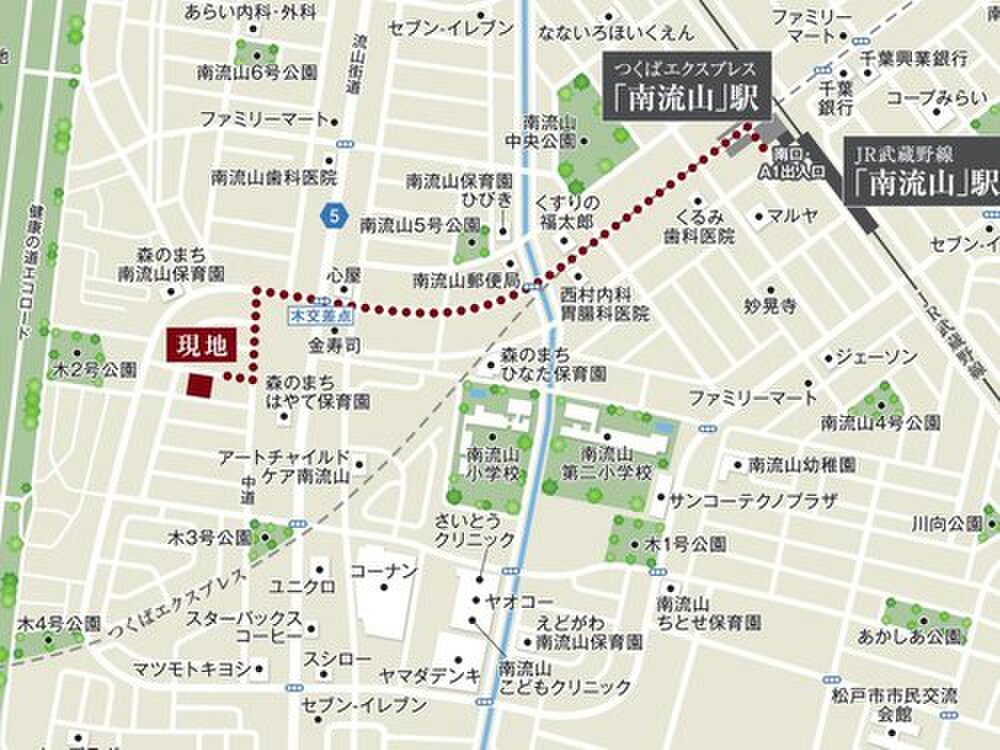 JR武蔵野線「南流山」駅 徒歩12分~13分 つくばエクスプレス「流山おおたかの森」駅 車で約6.6km~6.9km JR常磐線「新松戸」駅 3.3km~3.5km |