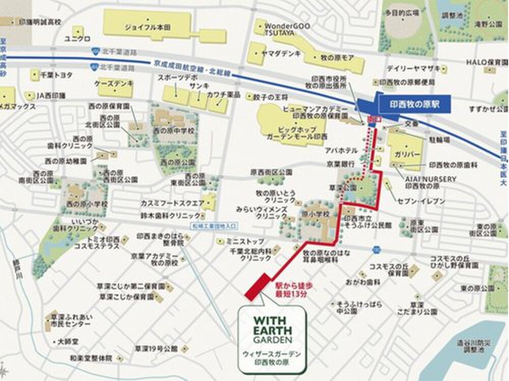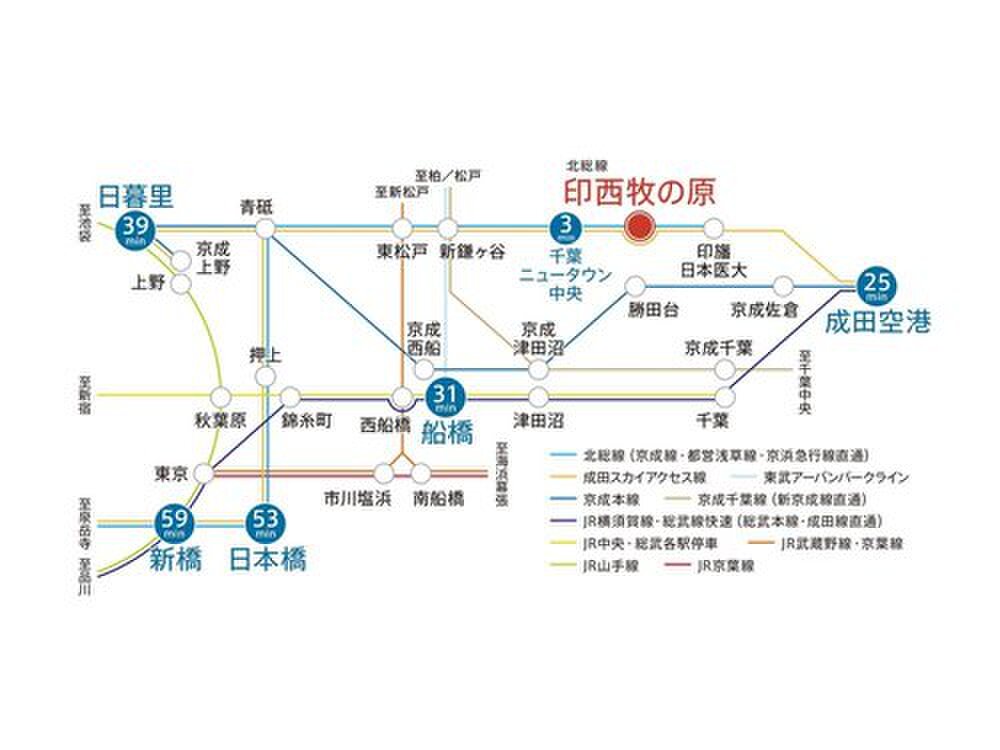 北総鉄道「印西牧の原」駅 徒歩13分~14分 北総鉄道「千葉ニュータウン中央」駅 徒歩62分~65分 東武野田線「新鎌ケ谷」駅 車16km~16.5km |